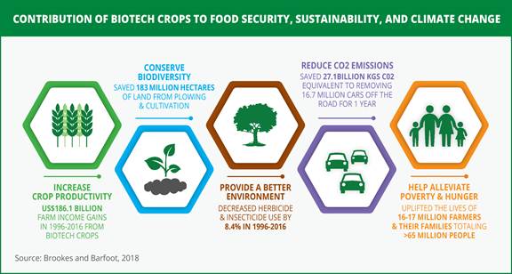 increasing crop productivity by by 657.6 million tons valued at US$186.1 billion in 1996-2016; and 82.2 million tons valued at US$18.2 billion in 2016 alone; conserving biodiversity in 1996 to 2016 by saving 183 million hectares of land, and 22.5 million hectares of land in 2016 alone; providing a better environmentby saving on 671 million kg. a.i. of pesticides in 1996-2016, and by 48.5 million kg in 2016 alone from being released into the environment; by saving on pesticide use by 8.2% in 1996-2016, and by 8.1% in 2016 alone; by reducing EIQ (Environmental Impact Quotient) by 18.4% in 1996-2016, and by 18.3% in 2016 alone reducing CO2 emissions in 2016 by 27.1 billion kg, equivalent to taking 16.7 million cars off the road for one year; and helping alleviate poverty through uplifting the economic situation of 16-17 million small farmers, and their families totaling >65 million people, who are some of the poorest people in the world (Brookes and Barfoot, 2018).