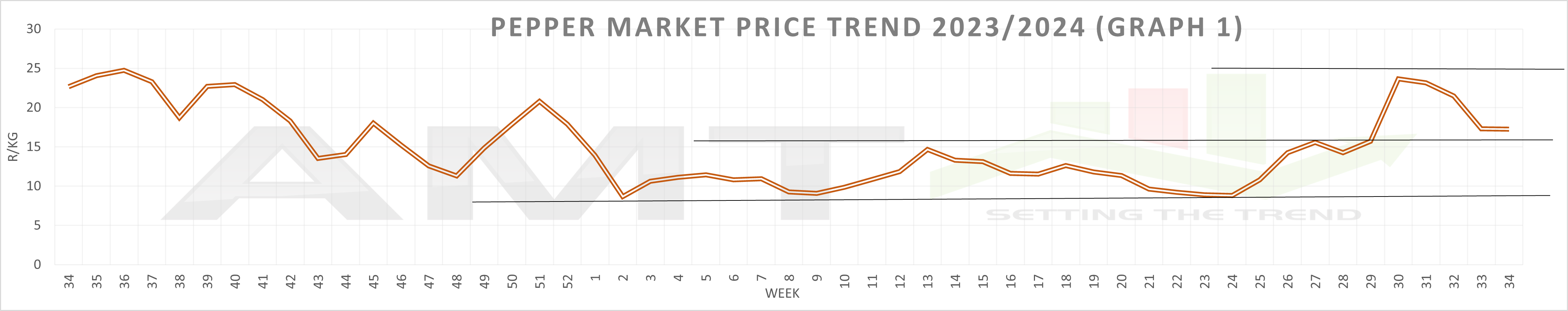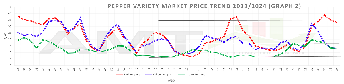 Examining the Pepper Market Price Trend for 2023/24 (Graph 1), we observe that from the second week of January 2024 (January 8) to the 29th week (July 15), the average pepper price fluctuated between R9/kg and R15/kg. In week 30, the price surged to R23/kg, a 53% increase, before falling to R17/kg by week 34. The Pepper Variety Market Price Trend for 2023/24 (Graph 2) shows a similar price spike in week 29, but red peppers were affected more severely and for a longer period compared to yellow and green peppers. By week 34, red pepper prices remained R20/kg higher than those of green and yellow peppers.