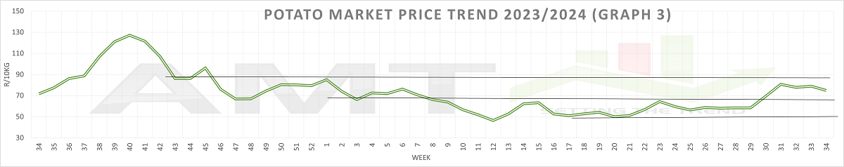 Turning to the Potato Market Price Trend for 2023/24 (Graph 3), we see that from week 40 in 2023 (October 2), the potato average prices peaked at R127/10kg and then declined until week 12 in 2024 (March 18), when they stabilized between R64/10kg and R50/10kg. In week 29 of 2024 (July 15), the price spiked again due to the impact of black frost. Following this spike, potato prices exhibited a slight downward trend until week 34 (August 19). The Potato Variety Price Trend for 2023/24 (Graph 4) closely mirrors the trend in Graph 3, unlike the more pronounced differences observed in the pepper price trends.