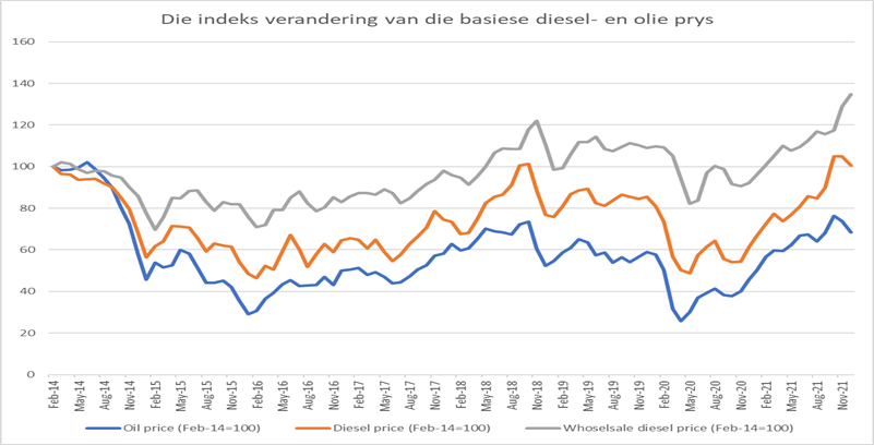 Figure 2 shows the price change of the oil price, basic diesel price (actual cost of diesel) and the wholesale diesel price from February 2014 to December 2021. The graph shows a clear correlation between the change in the oil price and a correlated change in the basic diesel price.