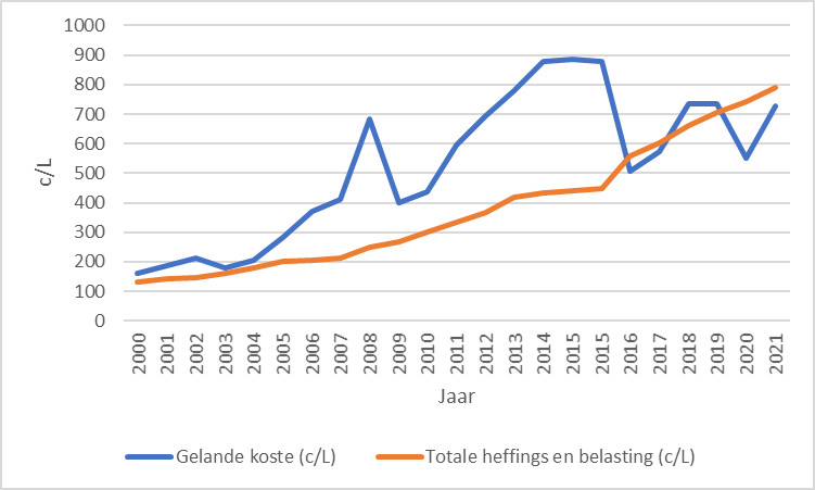 Figure 3 shows the relationship between the movement of landed costs of diesel with the movement of levies and taxes. In the year 2000, the basic diesel cost was R3.00. Of this R3.00 only 26% was tax compared to today's 33%.