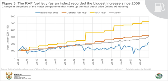 The two largest levies are the general fuel levy and the Road Accident Fund levy (RAF).
